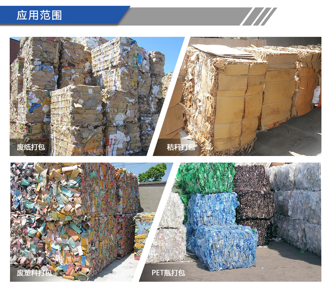 适用于废纸(纸板箱、新闻纸等),废塑料(PET瓶、塑料膜、周转箱等)、秸秆等松散的打包及自动捆扎。
