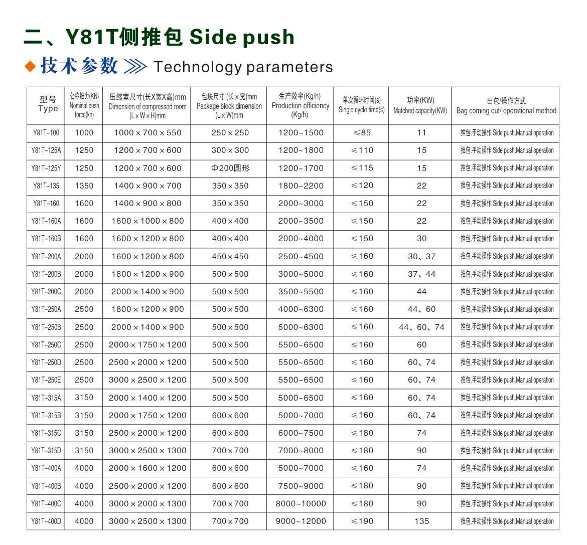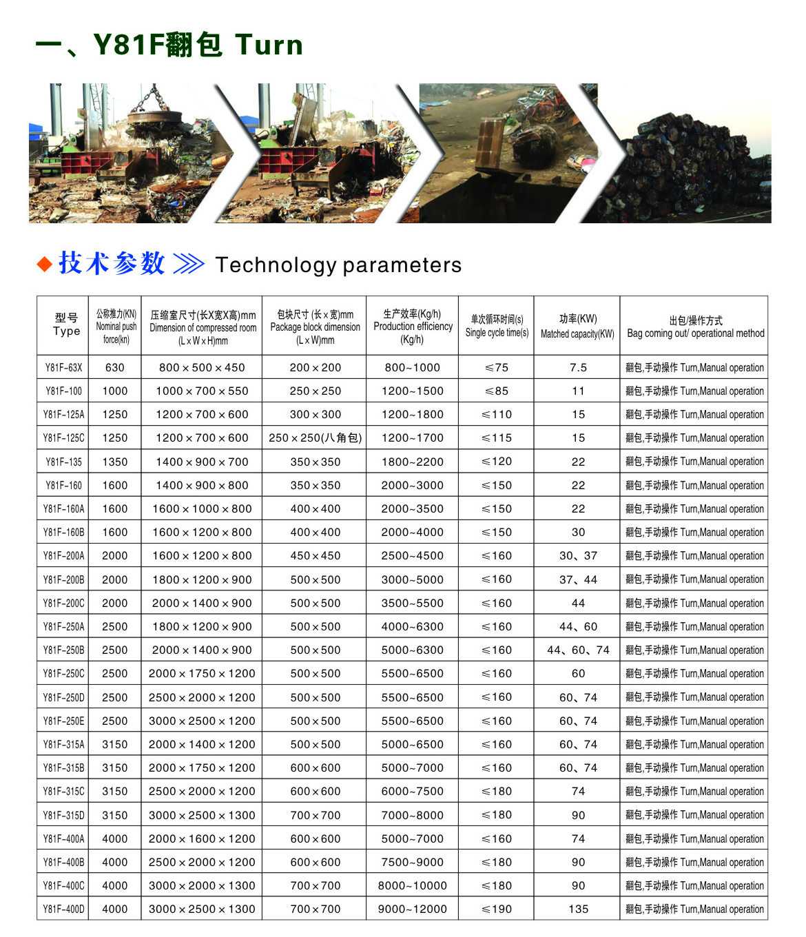 Y81系列金属液压打包机适用于炼钢、回收加工行业和有色金属冶炼行业。各种金属废料、钢屑、废钢、废铝、废铜等可挤压成矩形、圆柱形、八角形等形状的合格装料,降低运输和冶炼成本。
