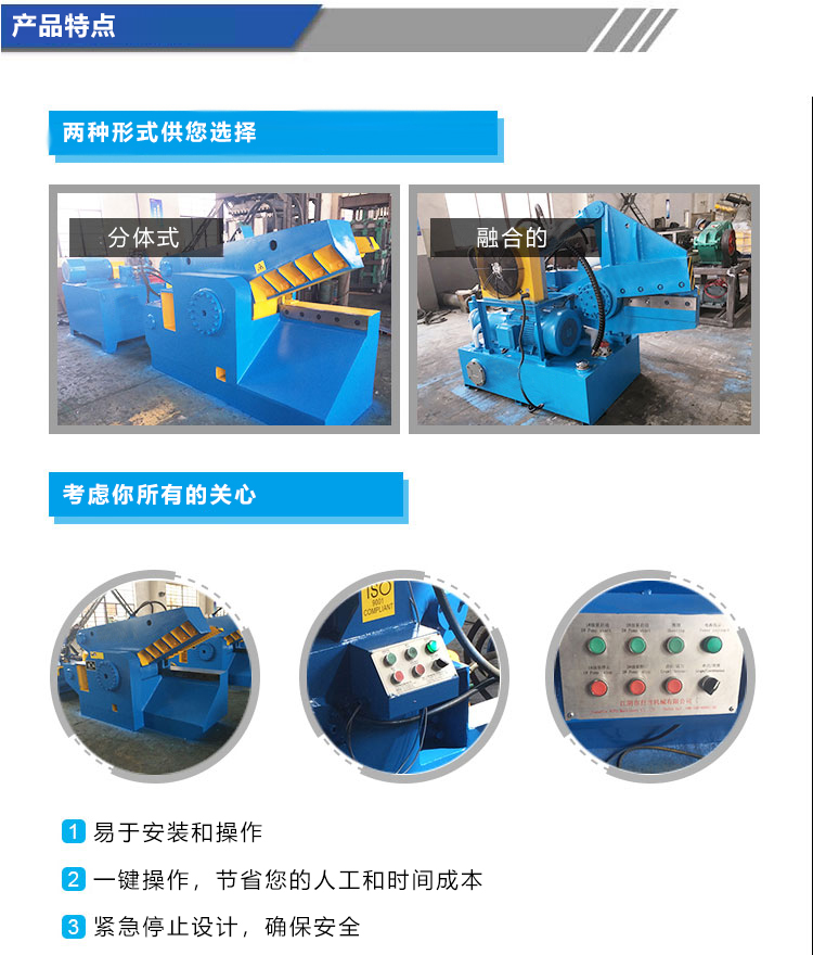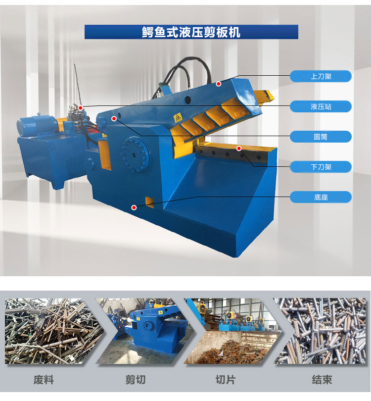 本机主要用于各种废金属型材(如圆钢、方钢、槽钢、钢角、工字钢、钢板、钢管)和各种废金属结构的冷态剪断及厚度≤3mm的轻薄金属废料进行挤压打包处理。